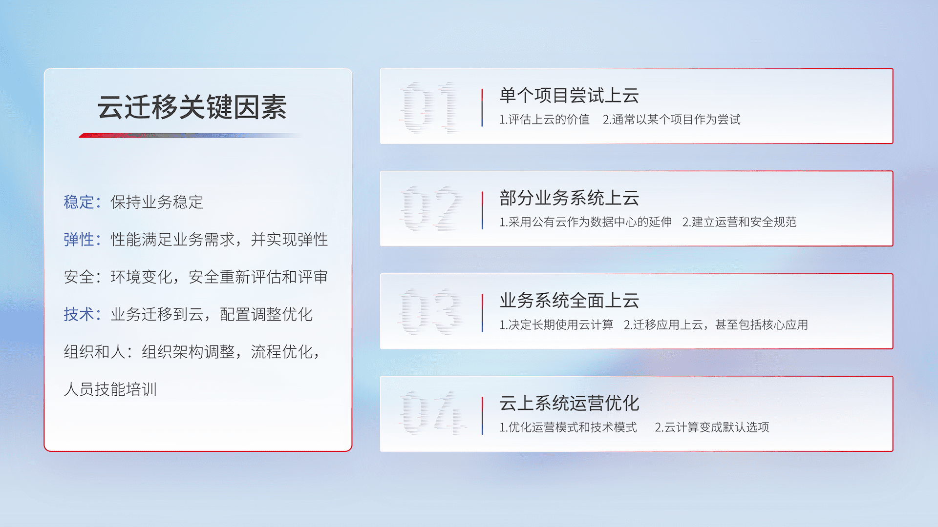 结合实际业务,,,,从规划设计、、云平台选型、、云原生改造、、、、数据迁移、、、集成交付,,迁移全过程为客户识别最佳上云路径,,,,做好风险识别管理,,设计网络架构、、、身份权限、、、安全审计合规、、、操作审计、、、、日志审计、、监控告警策略、、、多站点容灾设计等,,对云上基础设施进行整体规划,,,,提升IT治理水平,,,以满足弹性、、、高可用、、、、高性能的需求。。。